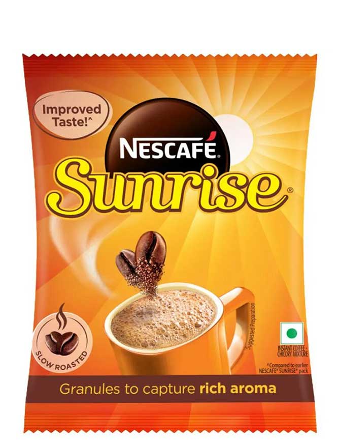 NESCAFÉ Sunrise is an instant coffee-chicory mixture made from 70% coffee powder and 30% chicory. This instant coffee is made with the fine blends of Arabica and Robusta coffee beans from the farms of South India. Legal Disclaimer : While we work to ensure that product information is correct, sometimes manufacturers may alter their ingredients in the products. Actual product packaging and ingredients may contain more and/or different information than that shown on our website. We strongly recommend that you please do not solely rely/depend on the information presented and you always be advised to read the labels, warnings and directions posted on the product before using or consuming the same. For additional information about the product you are advised to contact the manufacturer whose addresses are mentioned on the cover of the product. We take no responsibility for deviation / difference of product information mentioned in our website. Product Origin INDIA