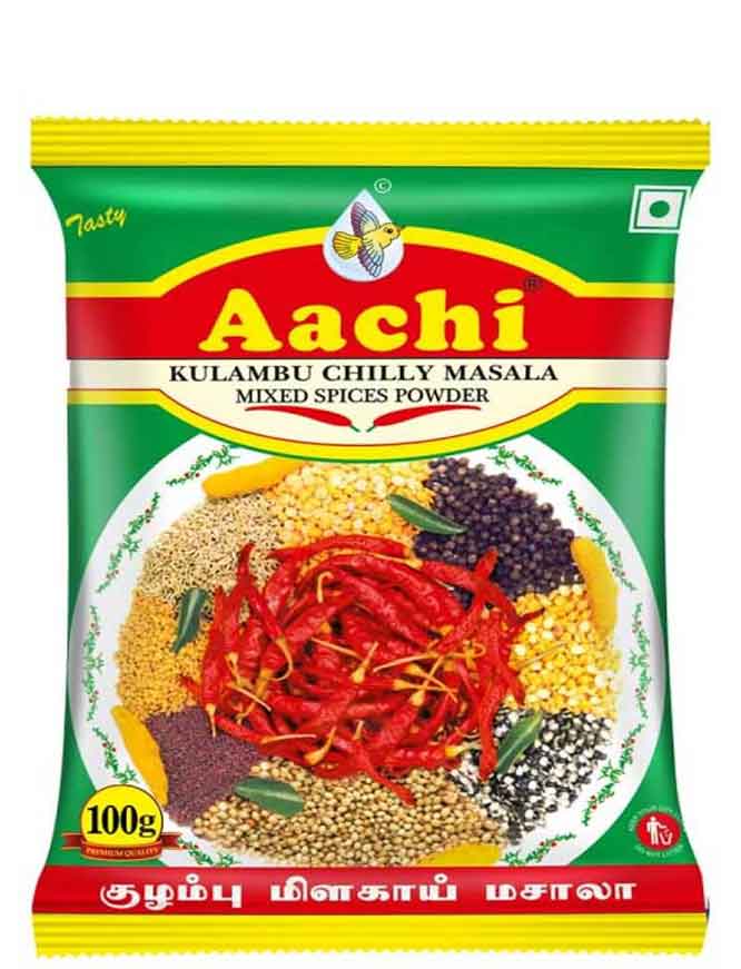 Aachi Kulambu chilli powder is used for Fish curry, Dry fish curry, Egg curry, Tamarind curry, Kara curry, Fenugreek curry. Ingredients Chilli, salt, coriander, pepper, Fenugreek, cumin seeds, Fennel, Tur dal, Turmeric, Mustard, Curry leaves. Place of origin: India Legal Disclaimer: While we work to ensure that product information is correct, on occasion manufacturers may alter their ingredient lists. Actual product packaging and materials may contain more and/or different information than that shown on our web site. We recommend that you do not solely rely on the information presented and that you always read labels, warnings, and directions before using or consuming a product. For additional information about a product, please contact the manufacturer.