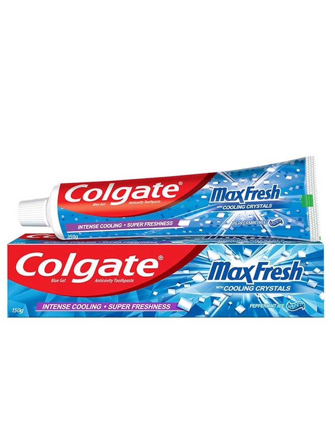 This blue gel toothpaste contains a unique cooling crystal that dissolves completely as you brush. Colgate Maxfresh gives you an icy wave of minty coolness and an intense burst of freshness Colgate Max fresh toothpaste contains menthol that gives intense cooling and super freshness. Legal Disclaimer : While we work to ensure that product information is correct, sometimes manufacturers may alter their ingredients in the products. Actual product packaging and ingredients may contain more and/or different information than that shown on our website. We strongly recommend that you please do not solely rely/depend on the information presented and you always be advised to read the labels, warnings and directions posted on the product before using or consuming the same. For additional information about the product you are advised to contact the manufacturer whose addresses are mentioned on the cover of the product. We take no responsibility for deviation / difference of product information mentioned in our website. Product Origin INDIA