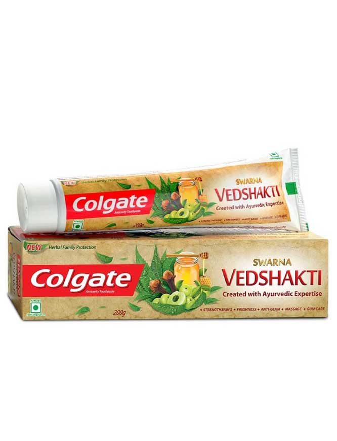 Colgate Swarna Vedshakti Toothpaste is the perfect blend of age-old natural ingredients and years of trusted oral care expertise. Contains the goodness of lavanga (clove), nimba (neem), madhu (honey), amalaki (amla), tulasi (basil), karpoor (camphor), pudina (mint), mishreya (fennel), twak (cinnamon), yavanika (thymol), kumari (aloe vera), Legal Disclaimer : While we work to ensure that product information is correct, sometimes manufacturers may alter their ingredients in the products. Actual product packaging and ingredients may contain more and/or different information than that shown on our website. We strongly recommend that you please do not solely rely/depend on the information presented and you always be advised to read the labels, warnings and directions posted on the product before using or consuming the same. For additional information about the product you are advised to contact the manufacturer whose addresses are mentioned on the cover of the product. We take no responsibility for deviation / difference of product information mentioned in our website. Product Origin INDIA