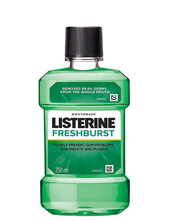Listerine reaches all parts of your mouth and removes 99.9% germs. With patented essential oil formulation, Listerine Fresh Burst Mouthwash deeply penetrates to remove bacteria in plaque biofilm. Legal Disclaimer : While we work to ensure that product information is correct, sometimes manufacturers may alter their ingredients in the products. Actual product packaging and ingredients may contain more and/or different information than that shown on our website. We strongly recommend that you please do not solely rely/depend on the information presented and you always be advised to read the labels, warnings and directions posted on the product before using or consuming the same. For additional information about the product you are advised to contact the manufacturer whose addresses are mentioned on the cover of the product. We take no responsibility for deviation / difference of product information mentioned in our website. Product Origin INDIA